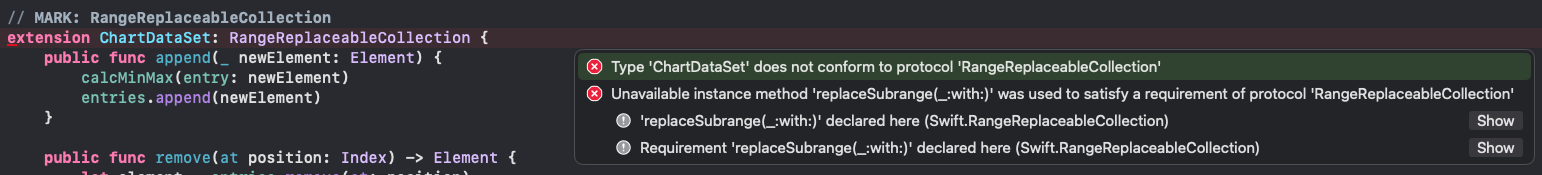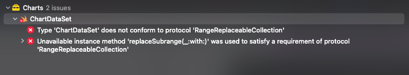 I am facing following errors in library - Type 'ChartDataSet' does not conform to protocol 'RangeReplaceableCollection' Unavailable instance method 'replaceSubrange(_:with:)' was used to satisfy a