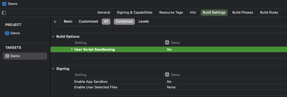 (User Script Sandboxing 옵션을 No 로 변경해주어 Swift가 아닌 파일을 읽을 수 있도록 해줍니다.)