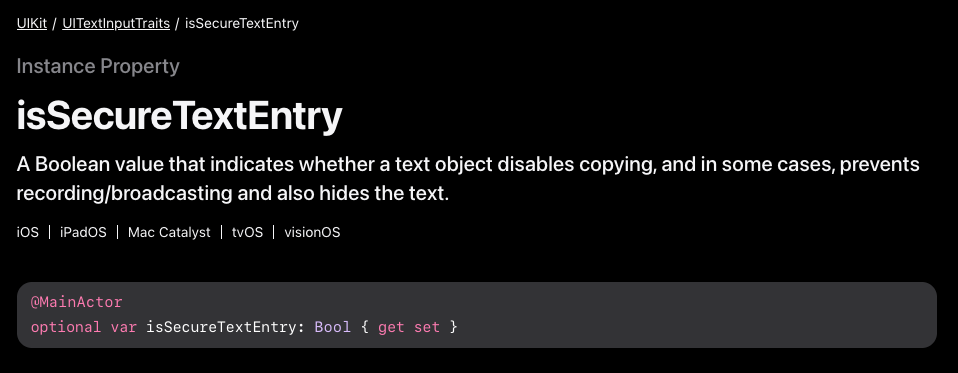 흔히 해당 프로퍼티는 사용자가 비밀번호와 같은 노출되면 안되는 정보를 입력할 때 TextField 에 입력된 Text 가 화면에 표시되지 않도록 해주는 역할을 한다. 공식 홈페이지 문서를 살펴보면 설명에 복사도 비활성화를 해주고 녹음과 브로드캐스트도 방지 해준다고 되어있다.
