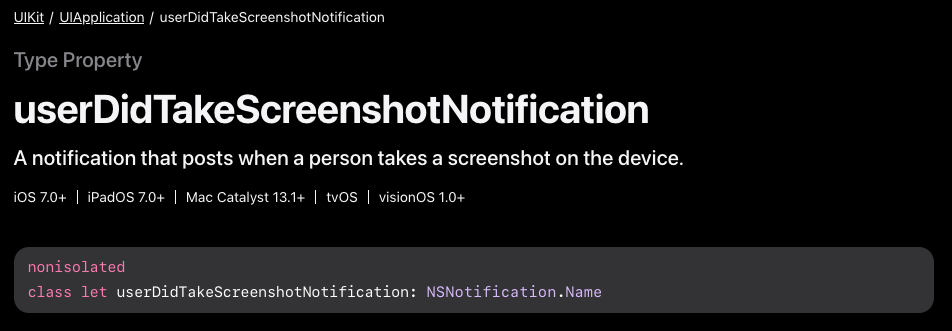 forName: UIApplication.userDidTakeScreenshotNotification,