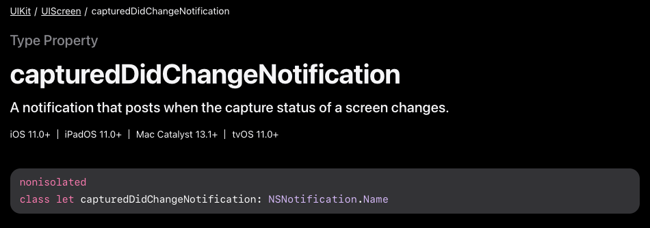 캡처의 경우 `UIScreen.capturedDidChangeNotification` 알림을 이벤트로 추가하여 감지할 수 있다.